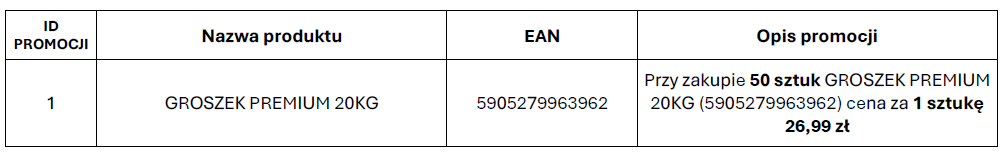 3. Z zastrzeżeniem postanowień poniższych, Uczestnik, który w okresie obowiązywania akcji promocyjnej dokona zakupu Produktów Promocyjnych oznaczonych tym samym ID promocji otrzyma rabat zgodnie z informacją zawartą w kolumnie Opis promocji [Rabat].