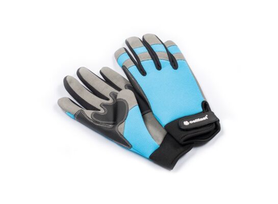 Wytrzymałe rękawice przeznaczone do cięższych prac ogrodowych. Zewnętrzna część wykonana z elastycznego poliestru z dodatkowymi zabezpieczeniami palców ze skóry syntetycznej. Wzmocnienie kciuka oraz części wewnętrznej rękawic zapewnia pewny chwyt i amortyzację. Mankiet zapinany na rzep.