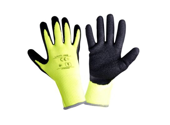 Wykonane z materiału zwiększającego widoczność. Powlekane lateksem o porowatej strukturze zwiększającym odporność na przetarcia i rozdarcia oraz podwyższającym przyczepność. Chronią przed zimnem.