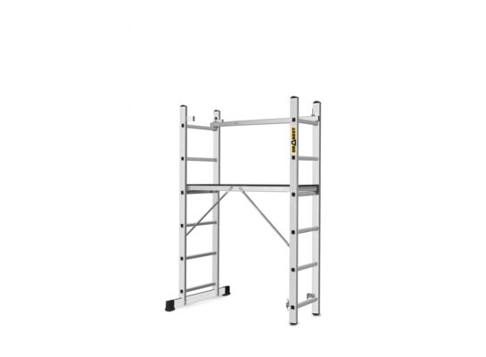 Rusztowanie drabinowe to niezwykle trwała i solidna kontraktacja z wysokogatunkowego aluminium, który jest odporny na wieloletnie działanie niekorzystnych czynników atmosferycznych. Dedykowane do lżejszej pracy budowlanej, wykończeniowej oraz remontowej, zarówno wewnątrz budynków, jak i na zewnątrz. 3w1: rusztowanie, drabina przystawna, drabina wolnostojąca