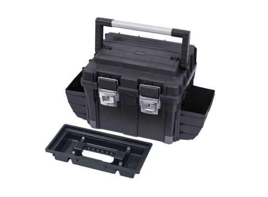 Skrzynka narzędziowa HD Compact 1 Plus to wygodny sposób do przechowywania i transportu narzędzi. Komfort użytkowania zapewnia ergonomiczna aluminiowa rączka, antypoślizgowe nóżki i głęboka tacka z miejscem na nasadki oraz bity. Specjalny uchwyt umożliwia przemianę skrzynki w mini stół narzędziowy. Wytrzymałe, metalowe zapięcia skutecznie zabezpieczają zawartość skrzyni. Pokrywa skrzyni wyposażona została w funkcjonalną szczelinę do przycinania wraz z miarką. Boczne kabury narzędziowe pozwalają