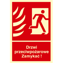 Oznaczenie "Drzwi przeciwpożarowe. Zamykać! Kierunek drogi ewakuacyjnej w lewo" 15 x 22,2