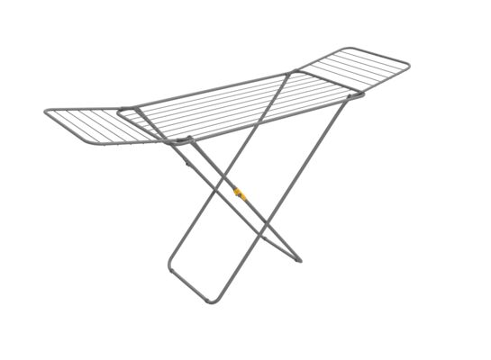 Stabilna suszarka do bielizny z rozkładanymi ramionami o łącznej powierzchni suszenia 18m. Opatentowana konstrukcja pozwala na zablokowanie ramion po złożeniu, co ułatwia przenoszenie i przechowywanie suszarki. Dla dodatkowego bezpieczeństwa stelaż wyposażony jest w mechanizm blokujący nogi podczas gdy suszarka stoi rozłożona.