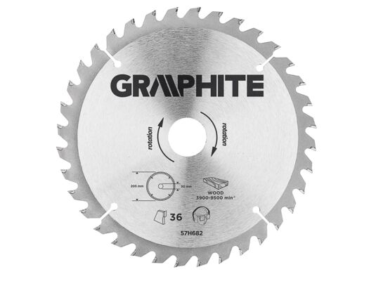 Tarcza do pilarki widiowa GRAPHITE (numer referencyjny 57H682) o średnicy zewnętrznej 205 mm, wykonana ze stopu stali manganowej MN65 o dużej odporności na temperaturę i odkształcenia. Zęby z nakładkami z węglika spiekanego YG6A pozwalają na zgrubne cięcie drewna i materiałów drewnopochodnych, takich jak sklejka, płyta wiórowa, MDF. Zawarte w opakowaniu pierścienie redukcyjne umożliwiają zastosowanie tarczy do większości modeli pilarek.