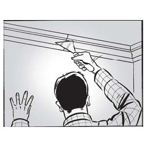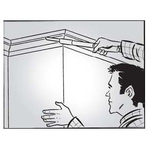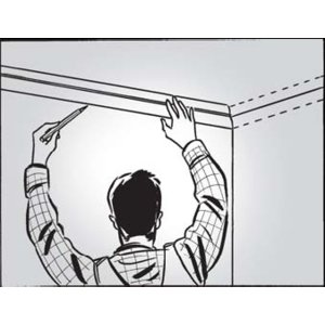 Zaczynamy od narożnika pomieszczenia, obcinając skośnie końcówkę gzymsu. Przykładając gzyms w planowane miejsce montażu i obrysowując go delikatnie ołówkiem, otrzymamy linie pomocnicze, do których będziemy równać przyklejany gzyms. Powierzchnię gzymsu pokrywamy równomiernie specjalnym klejem do styropianu i przykładamy do sufitu, orientując się według wyznaczonych linii.