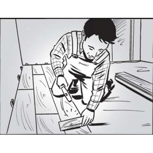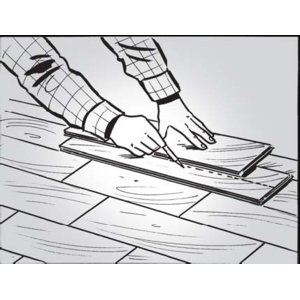 Aby wyznaczyć długość ostatniego panela/deski w rzędzie, odwracamy go laminatem do dołu, przesuwamy piórem do ściany i dosuwamy do ściany. Rysujemy linię cięcia równo z końcem przedostatniego panela/deski i odcinamy wyrzynarką.