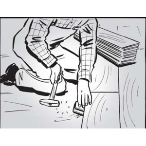 Pozostałą po odcięciu część wykorzystujemy jako pierwszą w następnym rzędzie. Po dopasowaniu do poprzedniego rzędu ostatni panel dociskamy za pomocą popychacza do paneli. Przy układaniu ostatniego rzędu paneli najczęściej jest konieczne przycięcie paneli wzdłuż ich długości. W tym celu odmierzamy odległość między ostatnim panelem a ścianą, odejmujemy od niej ok. 15 mm (szerokość szczeliny dylatacyjnej) i według wyznaczonej linii przycinamy panel. Po ułożeniu dociskamy popychaczem.Otwory drzwiowe