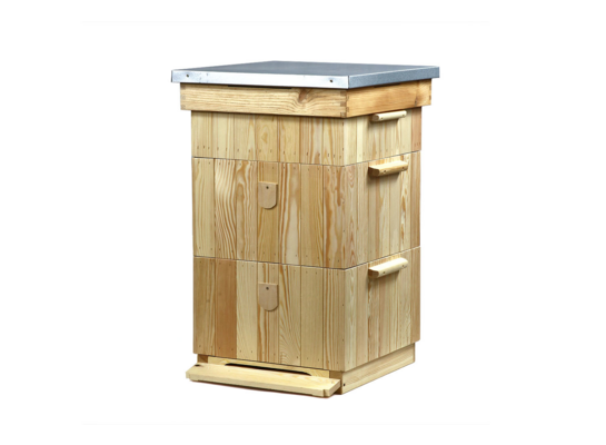 kompletna dennica higieniczna, 2 x korpus gniazdowy, 1 x korpus 1/2 (półnadstawka), daszek kryty blachą, zestaw nie zawiera ramek oraz stojaka, grubość ścian korpusu: 4,5 cm, grubość ocieplenia 2,5 cm