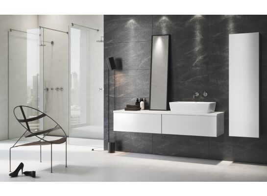Aby podkreślić elegancki charakter swojej łazienki, postaw na wyposażenie, które samo w sobie jest ozdobą. Wyeksponuj kształtną umywalkę na blacie szafki i zyskaj nie tylko piękny element wystroju wnętrza, ale także więcej miejsca na przedmioty w szafce pod umywalką.