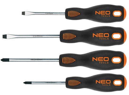 Zestaw wkrętaków NEO (numer referencyjny 04-204) zawiera 4 wkrętaki: płaskie i krzyżowe. Grot wkrętaka wykonany jest z wyjątkowo wytrzymałej stali chromowo-molibdenowej. Końcówka robocza grota została poddana obróbce cieplnej, dzięki czemu uzyskano odpowiednią twardość i odporność na zgięcia 56 HRC. Wkrętak posiada magnetyczną końcówkę. Trójgraniasty kształt uchwytu z wyprofilowanym oparciem dla kciuka zmniejsza obciążenie dłoni podczas pracy i ułatwia uzyskanie optymalnego momentu obrotowego. Uchwyt dwumateriałowy zapobiega ślizganiu się w dłoni, odporny jest na działanie chemikaliów, olejów i smarów. Jakość narzędzia potwierdzona certyfikatem TÜV i 25-letnią gwarancją producenta. Marka NEO spełnia oczekiwania profesjonalistów.