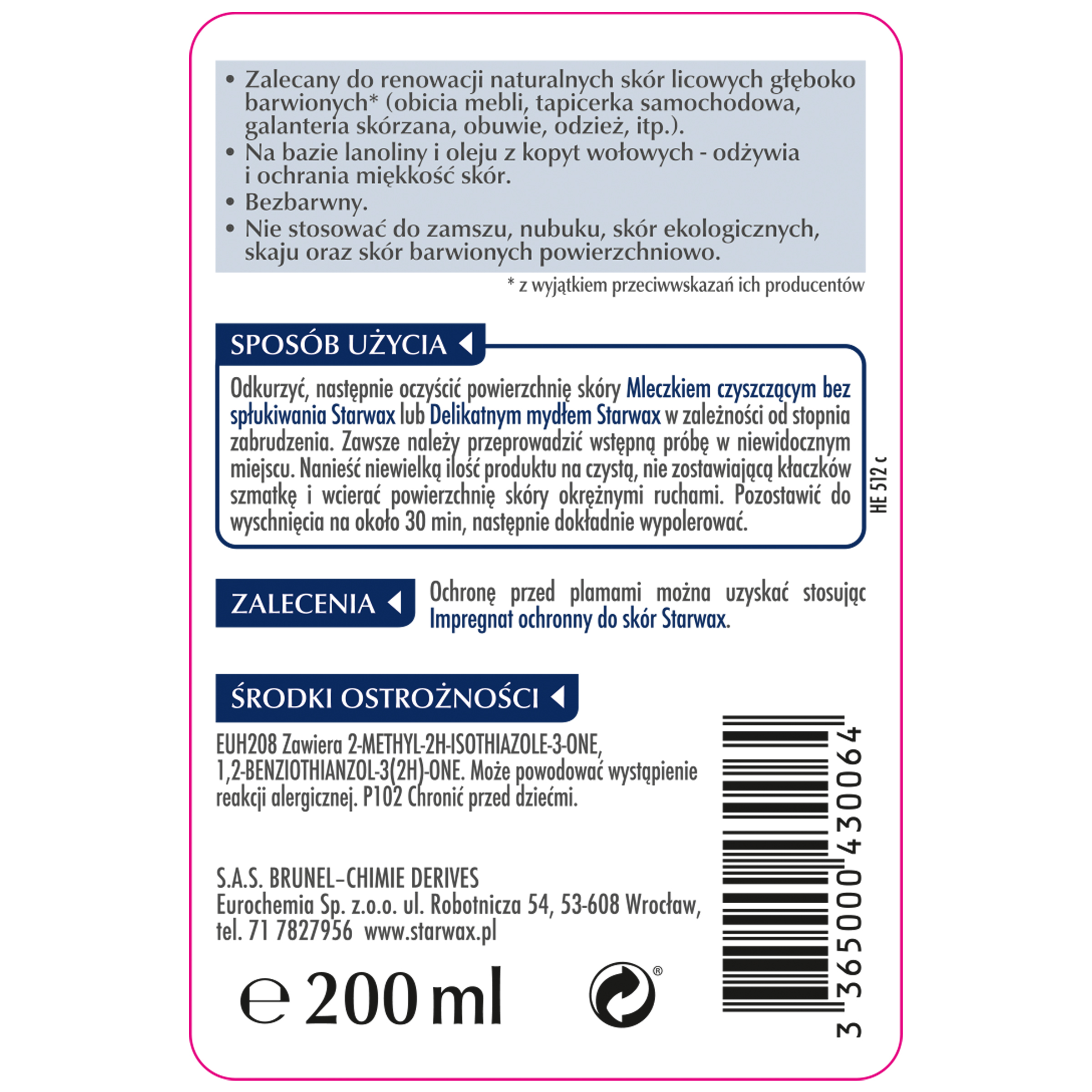 Konserwuje, chroni przed wilgocią, pięknie nabłyszcza naturalne skóry licowe. Przyjemny zapach wosku.