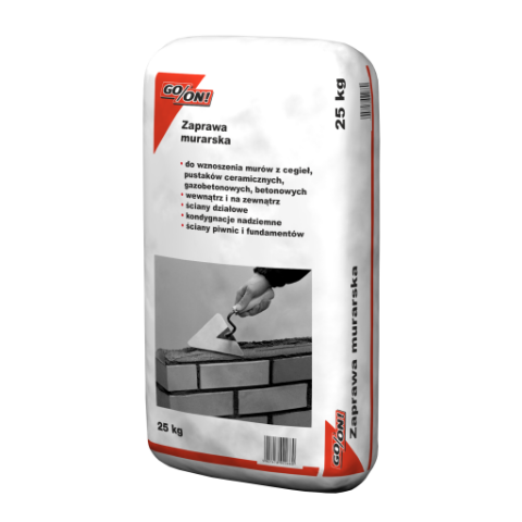 Zaprawa murarska GO / ON! 25 kg to uniwersalny, plastyczny i łatwo urabialny produkt klasy M5, który sprawdzi się podczas wykonywania wszelkich prac murarskich zarówno na zewnątrz, jak i wewnątrz budynków. Zaprawa jest przeznaczona do wznoszenia murów z cegieł, pustaków ceramicznych, gazobetonowych i betonowych, a także ścian działowych, kondygnacji nadziemnych oraz ścian piwnic i fundamentów. Średnia wydajność produktu wynosi 50 kg / m² dla muru na ½ cegły, a stosować go można, gdy temperatura utrzymuje się w zakresie od 5 do 25°C.