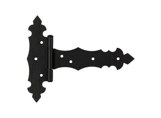 Zawias trójkątny do skrzyń i okiennic, ozdobny, malowany proszkowo na czarno.