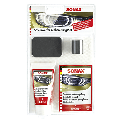 Zestaw do odnawiania reflektorów SONAX pozwoli Ci na ręczną renowację zmatowiałych i pożółkniętych plastikowych kloszy przednich lamp. Za jego pomocą przywrócisz oryginalną przeźroczystość kloszy reflektorów, usuniesz drobne zarysowania, a także właściwie zabezpieczysz powierzchnie przed ponownym zmatowieniem i wyblaknięciem. Komplet zawiera pastę i gąbkę do polerowania reflektorów, ściereczki do polerowania, czyszczenia i nasączone środkiem zabezpieczającym, a także nakładki oraz uchwyt do szlifowania.