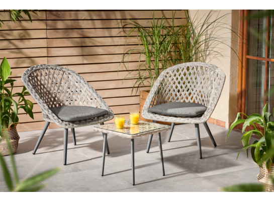 Komplet składa się z dwóch foteli oraz stolika kawowego. Meble cechują się estetycznym wykonaniem, które idealnie sprawdzi się w różnych aranżacjach przestrzeni balkonowej – szczególnie w stylu nowoczesnym oraz boho.