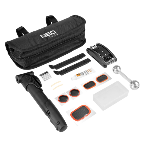 Naprawczy zestaw rowerowy marki NEO zawiera m.in. pompkę, łyżkę do opon, metalowy klucz sześciokątny, multitool rowerowy, łaty do dętek, wężyki silikonowe, klej i zdzierak, czyli elementy, które warto mieć zawsze pod ręką, szczególnie w terenie, gdzie ryzyko uszkodzenia roweru jest znacznie większe, a pomoc mniej dostępna.