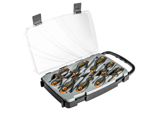 Zestaw wkrętaków NEO (numer referencyjny 04-208) zawiera 9 wkrętaków: płaskie i krzyżowe. Grot wkrętaka wykonany jest z wyjątkowo wytrzymałej stali S2. Końcówka robocza grota została poddana obróbce cieplnej, dzięki czemu uzyskano odpowiednią twardość i odporność na zgięcia. Wkrętaki posiadają magnetyczną końcówkę. Trójgraniasty kształt uchwytu z wyprofilowanym oparciem dla kciuka zmniejsza obciążenie dłoni podczas pracy i ułatwia uzyskanie optymalnego momentu obrotowego. Uchwyt dwumateriałowy zapobiega ślizganiu się w dłoni, odporny jest na działanie chemikaliów, olejów i smarów. Jakość narzędzia potwierdzona 25-letnią gwarancją producenta. Zestaw zawarty jest w użytecznym pudełku dla utrzymania porządku oraz łatwiejszego transportu Marka NEO spełnia oczekiwania profesjonalistów.