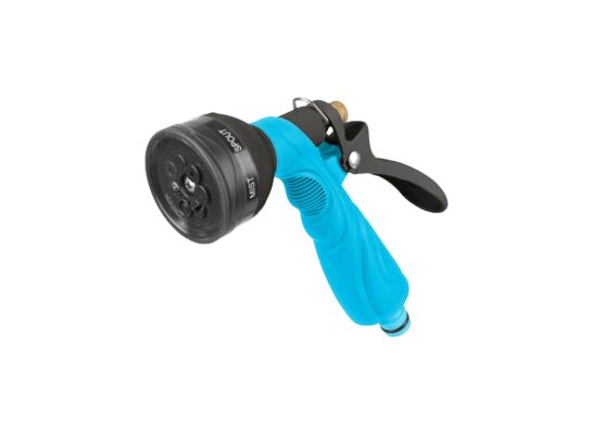 wykonany z metalu i tworzywa sztucznego, stopniowa regulacja strumienia wody w 7 różnych ustawieniach, bezstopniowa regulacja siły strumienia, wygodna blokada pracy ciągłej